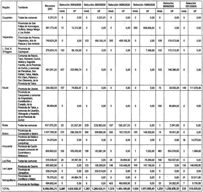 5. Los recursos comprometidos en el resuelvo 3. de la presente resolución, para los proyectos seleccionados en el concurso a que se llamó por resolución exenta Nº 584 (V. y U.), de 2020, cuyo cierre de postulación se efectuó el día 3 de diciembre de 2020, se resumen en el siguiente cuadro para cada región del país, incluyendo la suma total de familias beneficiadas y las Unidades de Fomento comprometidas, considerando los montos de subsidio de los proyectos, incluidos sus respectivos servicios de asistencia técnica y fiscalización técnica de obras. El presente detalle considera a todas las regiones convocadas en el Llamado con las respectivas selecciones efectuadas, para efectos de cuadratura y cierre del proceso.