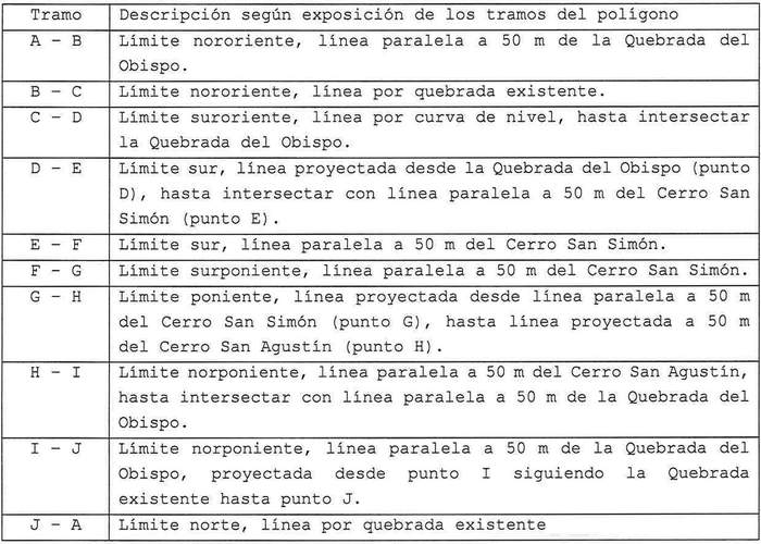 Quebrada del Obispo: define geográficamente el paisaje entre el Cerro San Simón y Cerro San Agustín, y en toda su extensión es posible encontrar diferentes vestigios que conforman el conjunto a proteger. Es un sector de tránsito peatonal y su estado de conservación es regular. Se observan pequeños muros que delimitan sus aterrazamientos y bases, al parecer, de antiguas construcciones. En superficie se encuentran fragmentos de loza inglesa de fines del siglo XIX, además un pique o bocamina vertical profunda localizada en la entrada de la quebrada. A unos 4 m aproximadamente, se halla un pequeño basural asociado a elementos culturales correspondientes al siglo XX, década del ‘50 al ‘60 aproximadamente.