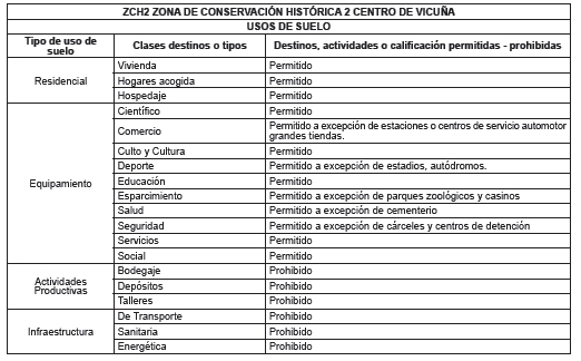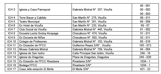 Los Inmuebles de Conservación Histórica se encuentran geográficamente determinados en los planos PRC-Vicuña-ZUS-01, PRC-Vicuña -ZUS-02, PRC-Vicuña-ZUS-03, PRC-Vicuña-ZUS-05 y PRC- Vicuña-ZUS-06, y son los que a continuación se indican: