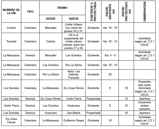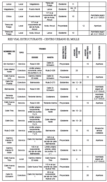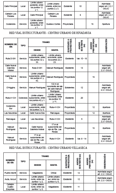 Art. 2.3.1 de la OGUC, y que se detallan en los cuadros siguientes por localidad:
