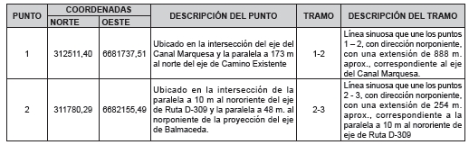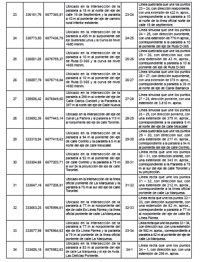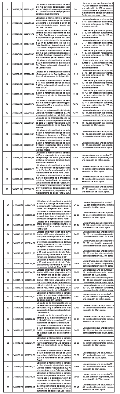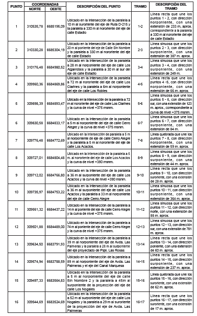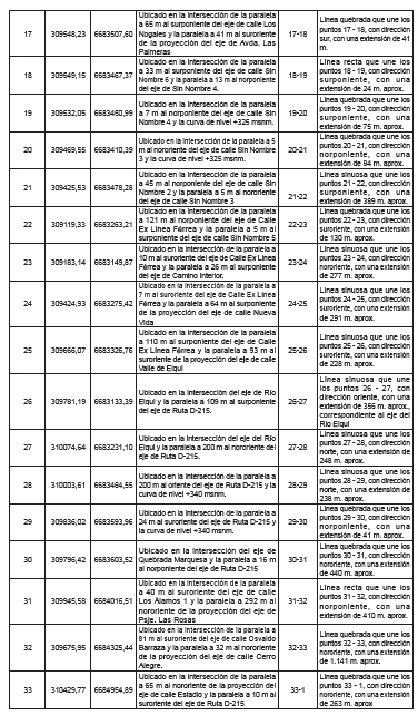 y la poligonal que une los puntos 1, 2, 3, 4, 5, 6, 7, 8, 9, 10, 11, 12, 13, 14, 15, 16, 17, 18, 19, 20, 21, 22, 23, 24, 25, 26, 27, 28, 29, 30, 31, 32 y 33 de la localidad Marquesa - Nueva Talcuna, cuya descripción se detalla a continuación: