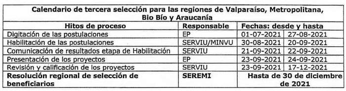 D.O. 30.09.2021ediante resolución del Ministro de Vivienda y Urbanismo se realizará la segunda y la tercera selección de beneficiarios del presente llamado, salvo para las regiones de Valparaíso, Metropolitana, Biobío y La Araucanía, cuya tercera selección deberá realizarla el Secretario Regional Ministerial correspondiente, en atención a los recursos disponibles, los que podrán redistribuirse y/o aumentarse por región, y a los factores de puntaje señalados en el artículo 72, del DS N° 27 (V. y U.), de 2016.