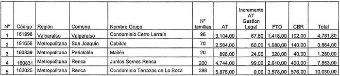 3. Asígnase a los grupos organizados seleccionados en el resuelvo 1. precedente, por concepto de pago por los Servicios de Asistencia Técnica, por las Labores de Fiscalización Técnica de Obra y pago de Aranceles al Conservador de Bienes Raíces para el desarrollo de sus proyectos, los montos expresados en Unidades de Fomento que se detallan a continuación: