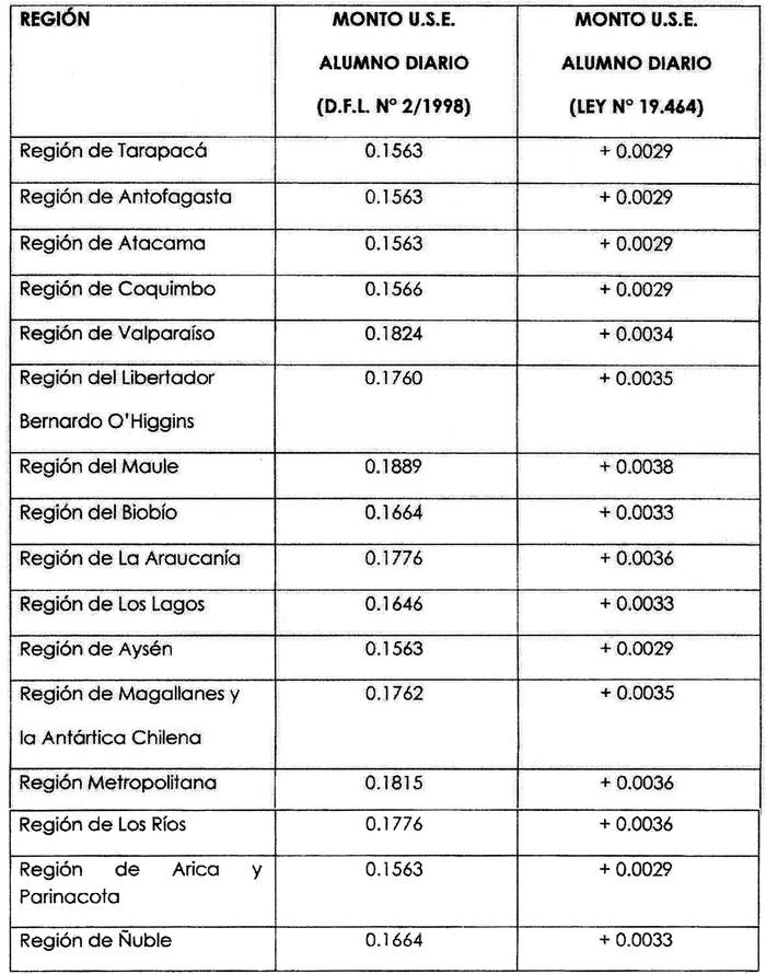 Artículo 1°: Fíjase para el año 2021 el monto unitario regional, en términos de Unidad de Subvención Educacional (U.S.E.), por alumno diario de subvención por alojamiento y alimentación, a los establecimientos educacionales subvencionados con servicio de internado, que se indica a continuación: