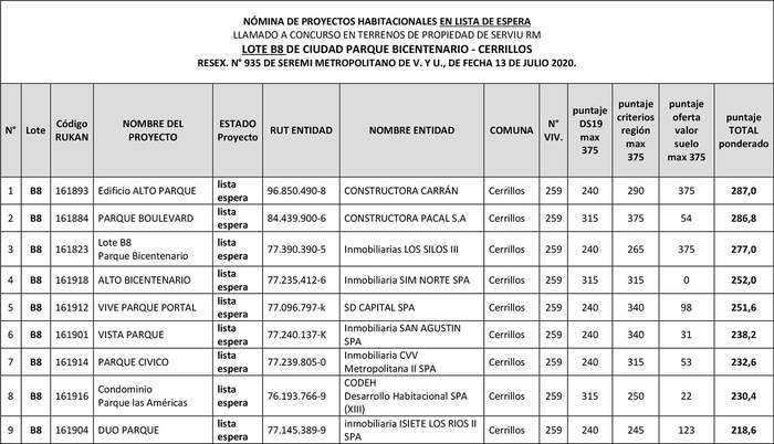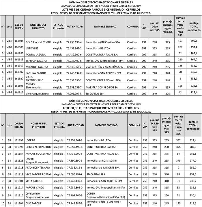 1° Apruébase la nómina de los 19 proyectos habitacionales elegibles, presentados al llamado a postulación en condiciones especiales para proyectos del Programa de Integración Social y Territorial, en dos terrenos (Lote B8 y Lote VIB2), de propiedad del Serviu Metropolitano, ubicados en la Ciudad Parque Bicentenario, de la comuna de Cerrillos, dispuesto por el Resuelvo 1. de la resolución exenta N° 935, de fecha 13 de julio de 2020, de esta Secretaría Ministerial, y su modificación. Los puntajes obtenidos por los 19 proyectos elegibles en proceso de evaluación, realizado por la Comisión Evaluadora, se detallan en el siguiente cuadro: