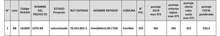 3° Selecciónese el proyecto habitacional de Integración Social y Territorial elegible denominado "Lote B8", Código de Proyecto N°161899, presentado por la Entidad Desarrolladora "Inmobiliaria B3 Ltda.", a desarrollarse en el Lote B8, por haber obtenido el puntaje final ponderado más alto entre los diez proyectos elegibles y por cumplir con todos los requisitos y las condiciones establecidas en la resolución exenta, que llamó a Concurso y que fue la única oferta presentada para el Lote B8.