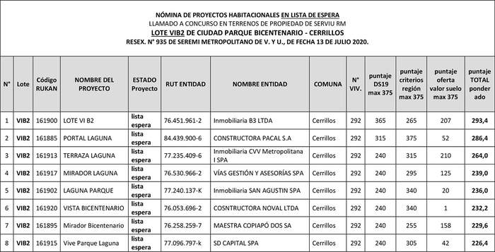 APRUÉBASE LA NÓMINA DE PROYECTOS SELECCIONADOS DEL LLAMADO A POSTULACIÓN EN CONDICIONES ESPECIALES DE PROYECTOS HABITACIONALES DEL PROGRAMA DE INTEGRACIÓN SOCIAL Y TERRITORIAL, DS N° 19 (V. Y U.), DE 2016, EN DOS LOTES DE PROPIEDAD DEL SERVIU METROPOLITANO, UBICADOS EN LA CIUDAD PARQUE BICENTENARIO, DE LA COMUNA DE CERRILLOS, DISPUESTO POR LA RESOLUCIÓN N° 935 EXENTA Y SUS MODIFICACIONES, DE FECHA 13 DE JUNIO DE 2020, DE LA SECRETARÍA MINISTERIAL METROPOLITANA DE VIVIENDA Y URBANISMO