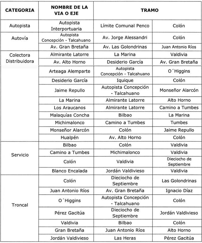 1. Establécese la Red Vial Básica de la comuna de Talcahuano, la que estará constituida por aquellas vías comprendidas en su radio urbano, que, conforme la categoría vial correspondiente, se detallan en el siguiente cuadro: