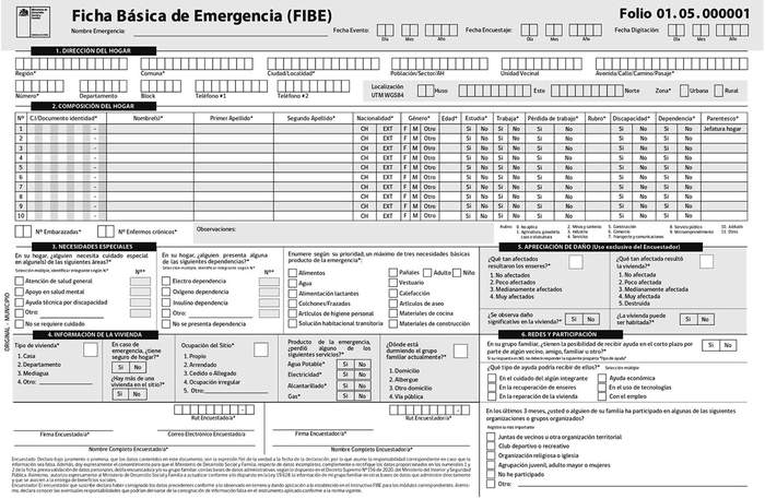 El diseño y administración de la Ficha Básica de Emergencia (FIBE) radica en la Subsecretaría de Servicios Sociales del Ministerio de Desarrollo Social y Familia (MDSF), específicamente en la División de Focalización, quien coordina su aplicación en conjunto con los municipios afectados y cuyo análisis es entregado periódicamente a la Oficina Nacional de Emergencia para la toma de decisiones asociadas a la respuesta a la emergencia.