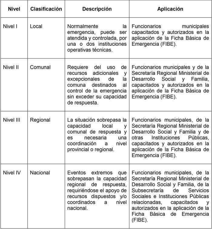 Tabla N° 1: Responsables de la aplicación de la FIBE Hídrica según nivel de la emergencia.