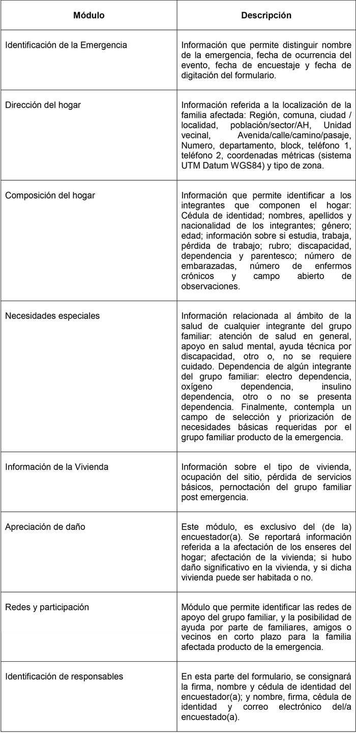 La ficha recopila información auto reportada, la cual debe ser respondida íntegramente por el informante del hogar, que se define más adelante. Además, considera campos que deben ser respondidos exclusivamente por el encuestador. Las preguntas de la ficha se organizan a través de los siguientes módulos, con el fin de recoger información sobre la composición del hogar y viviendas afectadas: