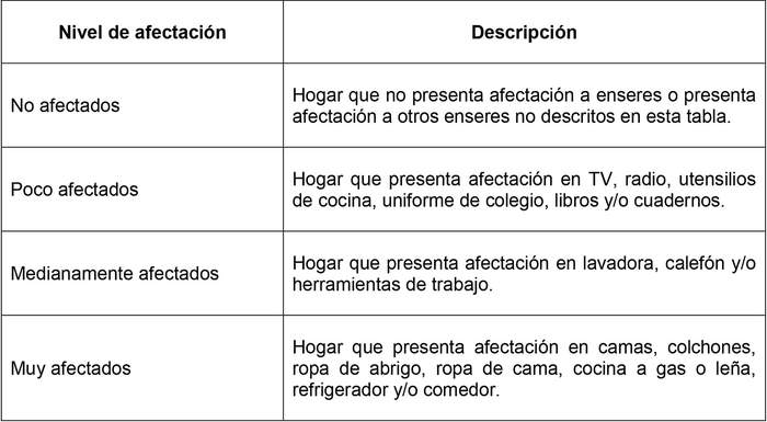 Tabla Nº 4: Criterios técnicos para definir el nivel de afectación a enseres.