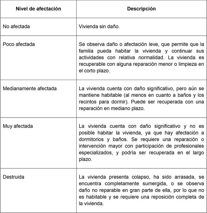 . En la pregunta "¿Qué tan afectada resultó la vivienda?", deberá responderse acorde a los siguientes criterios técnicos elaborados por el Ministerio de Vivienda y Urbanismo: