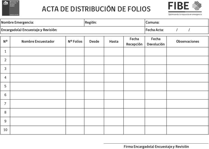 c) Distribución de formularios de la FIBE a cada uno de los Encuestadores(as) y registro de su entrega en el Acta de Distribución de Folios (anexo Nº 1).