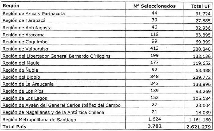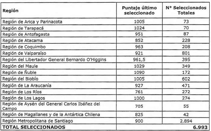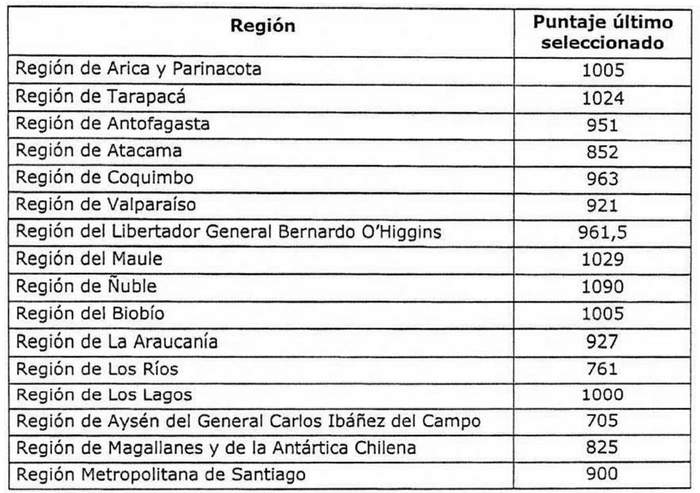 3. Establécese que, de acuerdo a la rectificación efectuada según lo señalado en el resuelvo 1. y a la nueva selección de beneficiarios, establecida en el resuelvo 2., y, practicada la evaluación de los postulantes conforme lo establecido en los artículos 22, 23 y 24 del DS Nº 49 (V. y U.), de 2011, y, en el resuelvo 12. de la resolución exenta Nº 1.140 (V. y U.), de 2020, el último seleccionado para cada región del país incluido en la nómina complementaria, ha obtenido el siguiente puntaje: