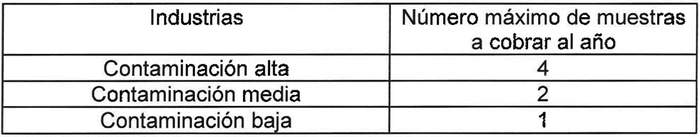 Los valores y número máximo de muestras a cobrar al año se han determinado de acuerdo a la clasificación de las industrias según el nivel de contaminación del efluente evacuado, cuya definición se indica a continuación: