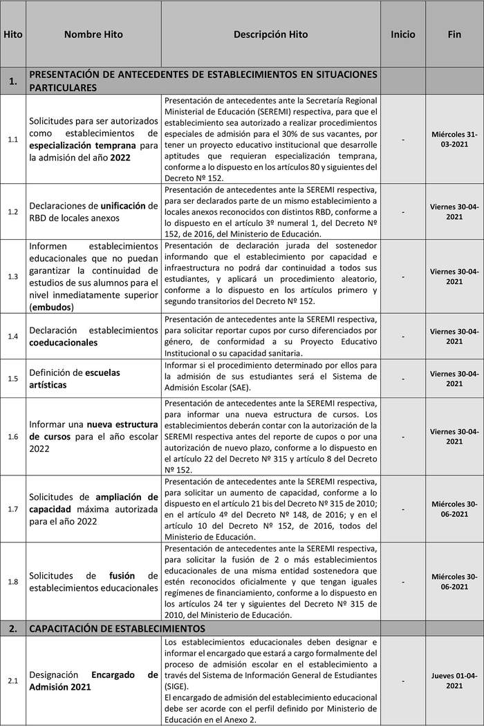 Artículo primero: Apruébase el siguiente calendario de admisión escolar para la postulación del año 2021 y admisión del año 2022, de establecimientos que reciben subvención o aportes del Estado de todas las regiones del país, según los hitos, fechas y períodos que comprende y que a continuación se detallan: