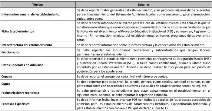. Tener conocimiento y acceso a información general del establecimiento, la cual deberá ser ingresada por el Encargado de Admisión en SIGE (por ejemplo: cupos totales de cada nivel, capacidad máxima del establecimiento, proyecto educativo, copago, reglamento interno, georreferenciación de la ubicación del establecimiento, entre otros).