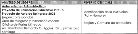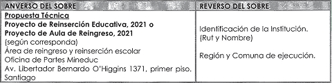 Sobre 2: Deberá contener el Formulario de Postulación (Anexo 3) impreso según el proyecto al que se postule. Además, se debe enviar una copia digital al correo del concurso, reinsercionescolar@mineduc.cl dentro del mismo plazo estipulado en el Anexo 1 para el envío de Propuestas.