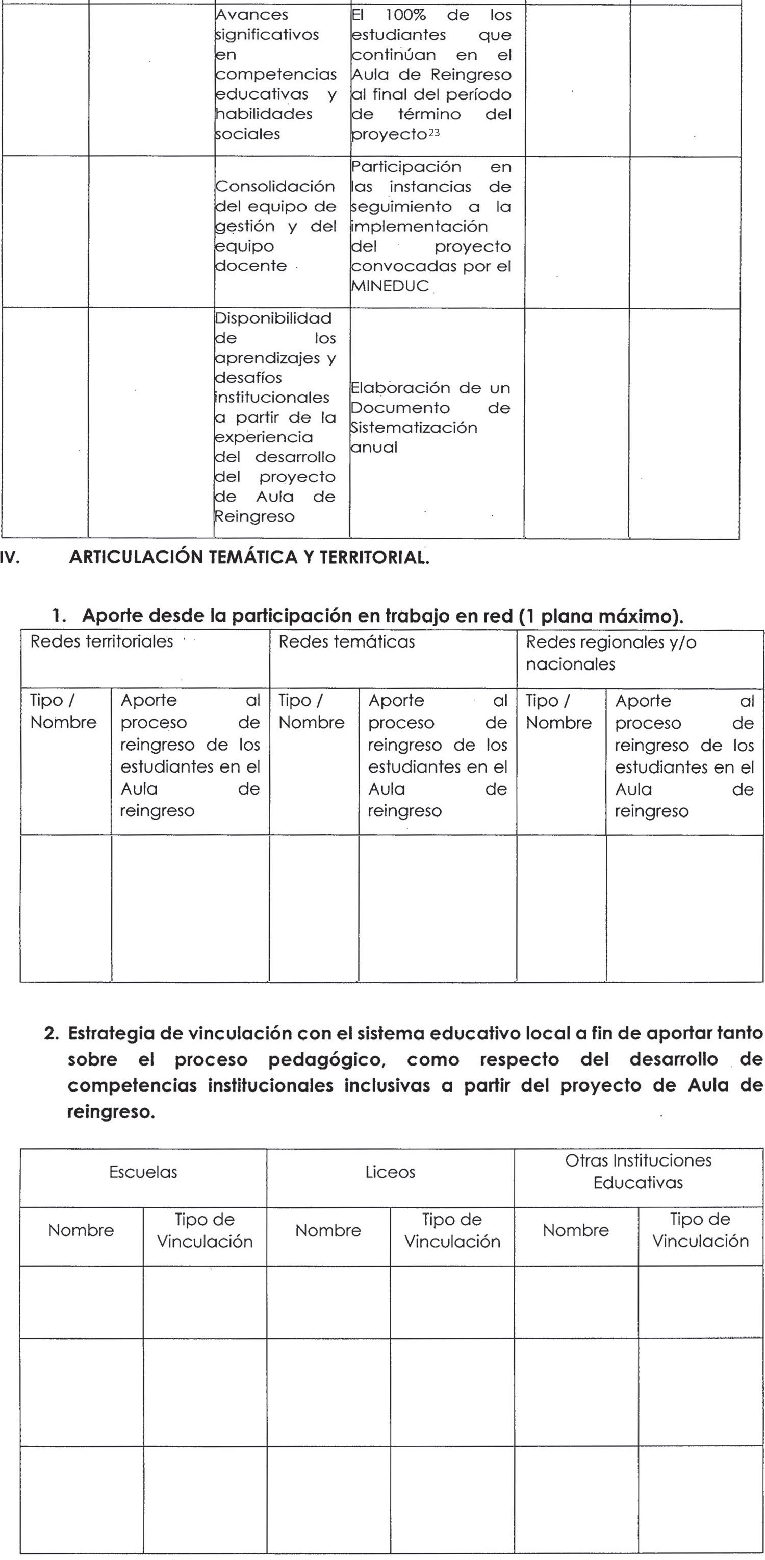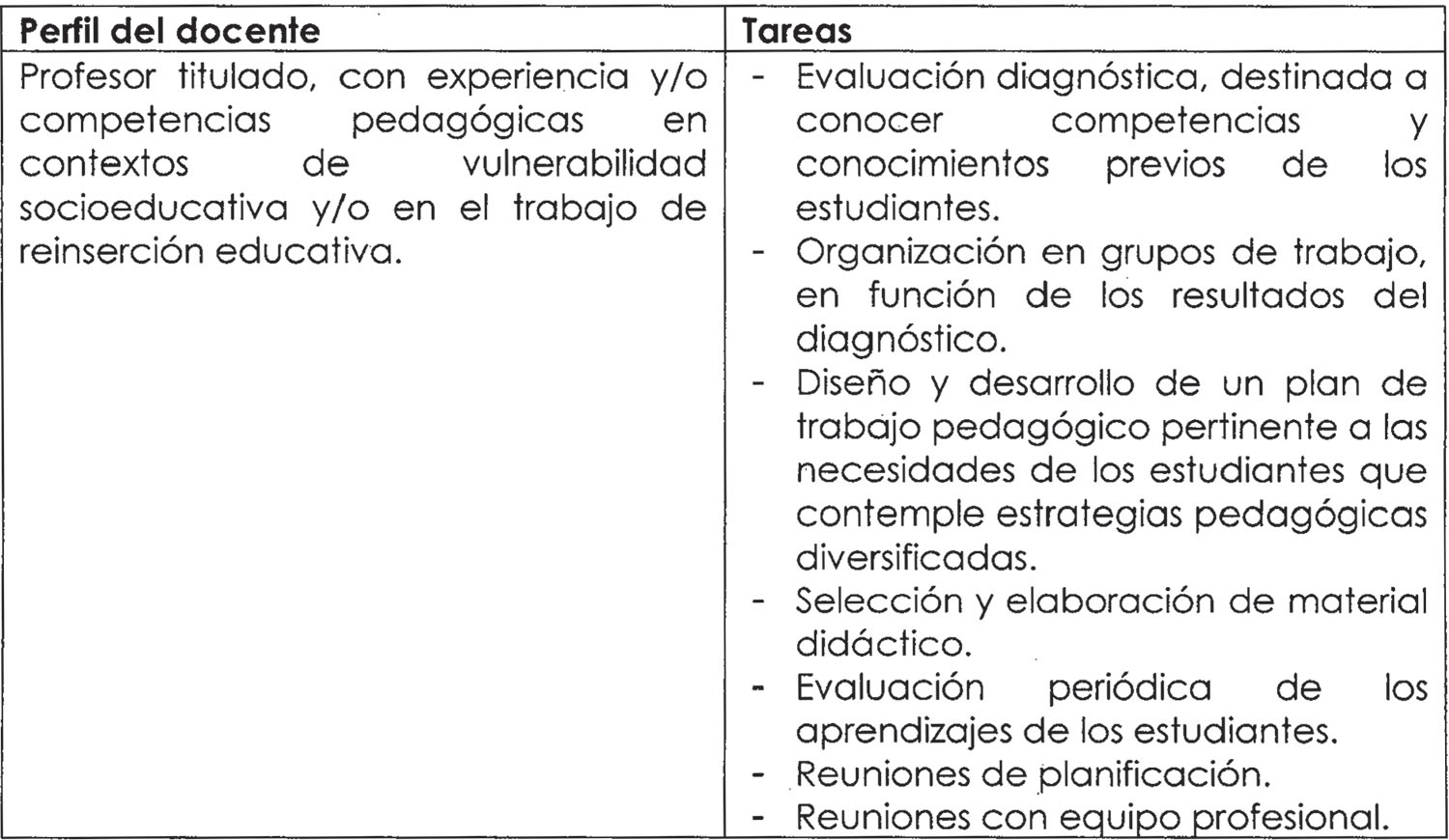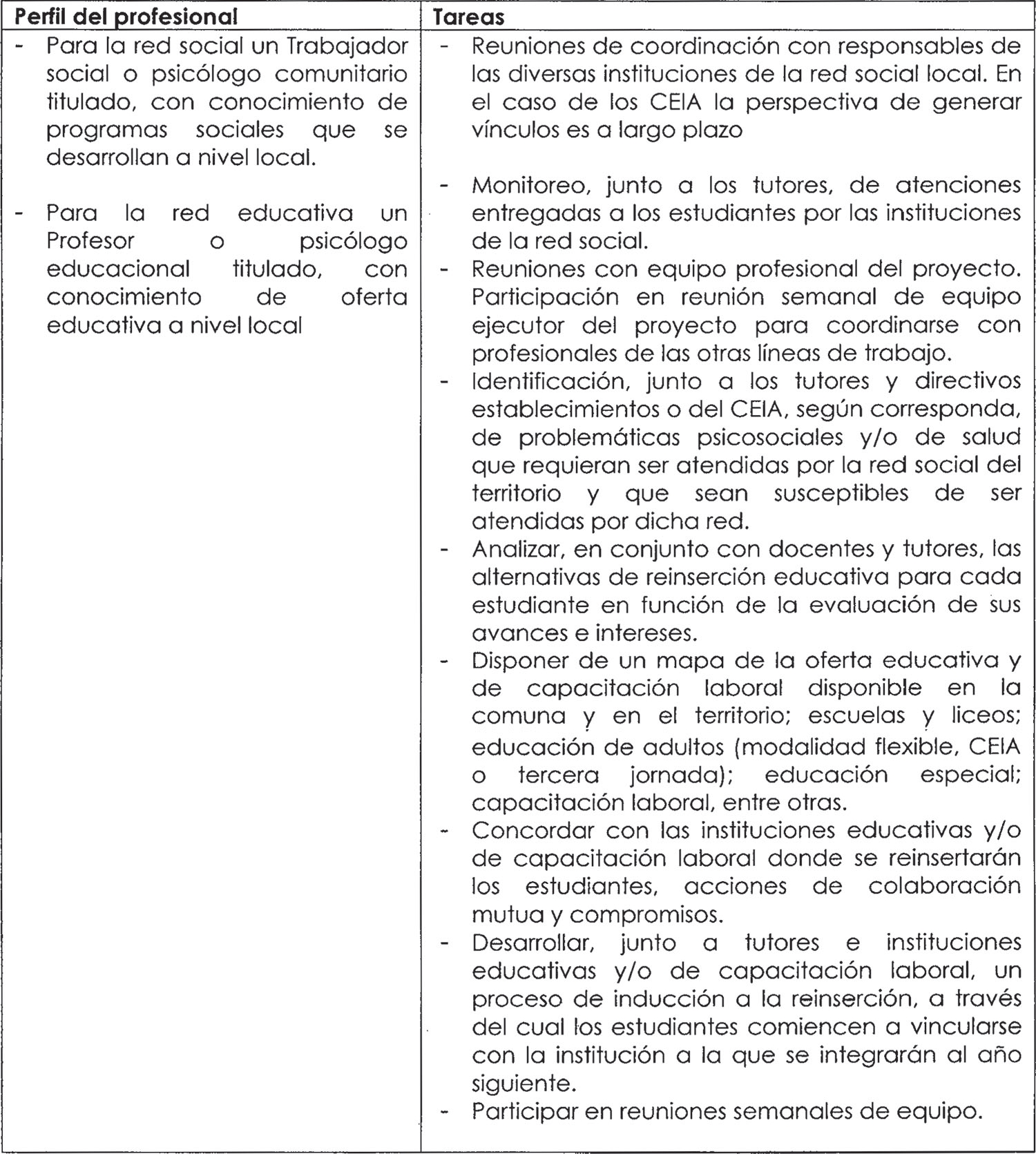 Además, los proyectos de reinserción y Aulas de Reingreso deben estar articuladas y trabajar sistémicamente con la red educativa local, a fin de disponer de alternativas educativas diferentes para la continuidad de las trayectorias educativas de los participantes de los proyectos.