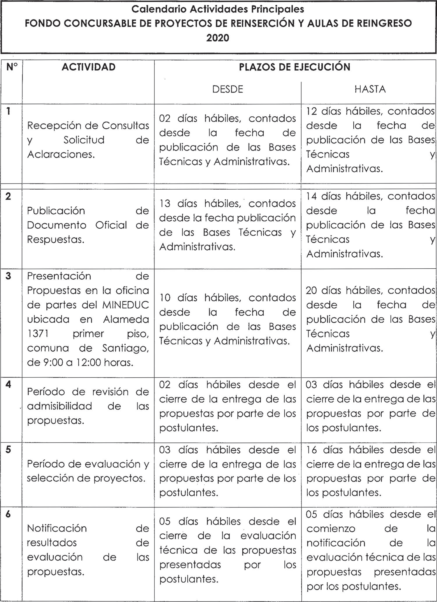 En caso de continuar con el estado de excepción constitucional de catástrofe establecido por la autoridad, regirá respecto al Anexo N° 1 Calendario de Actividades Principales, Fondos Concursable de Proyectos de Reinserción y Aulas de Reingreso, los siguientes plazos: