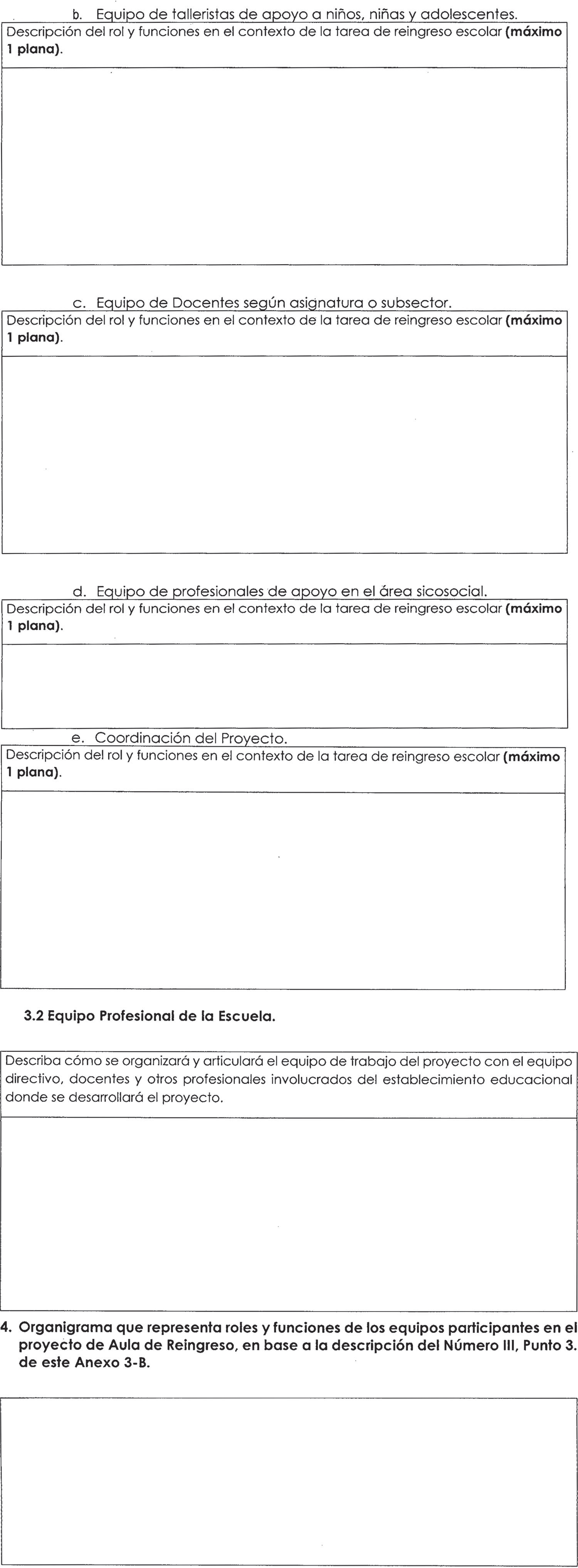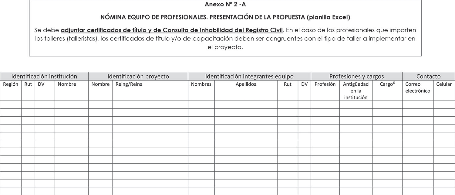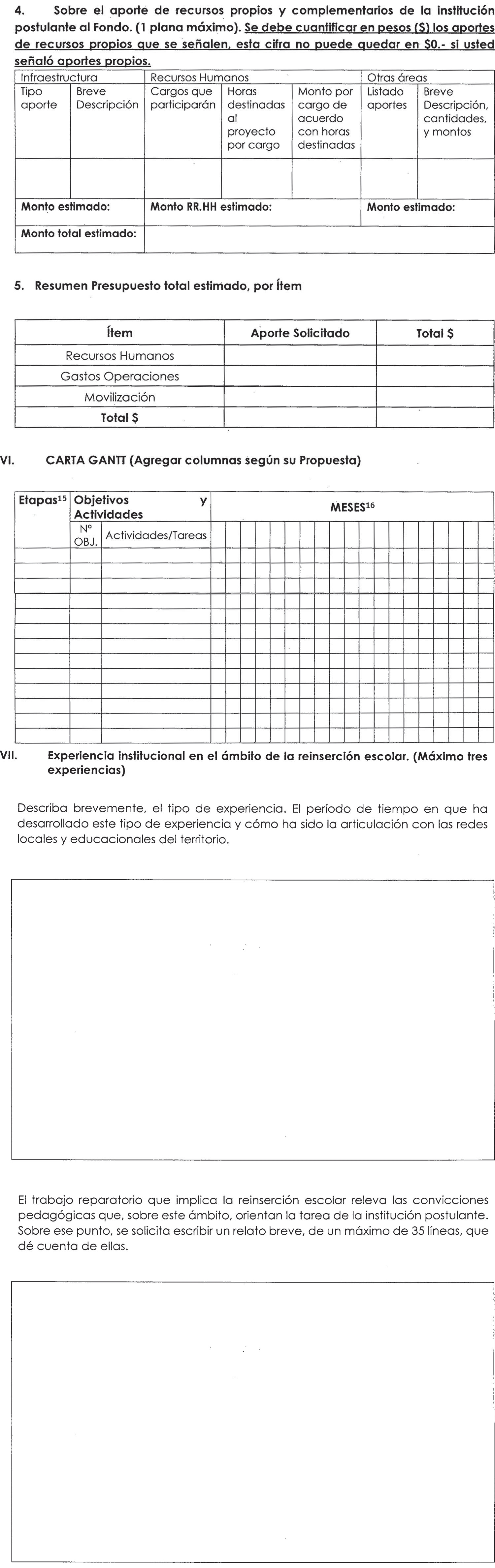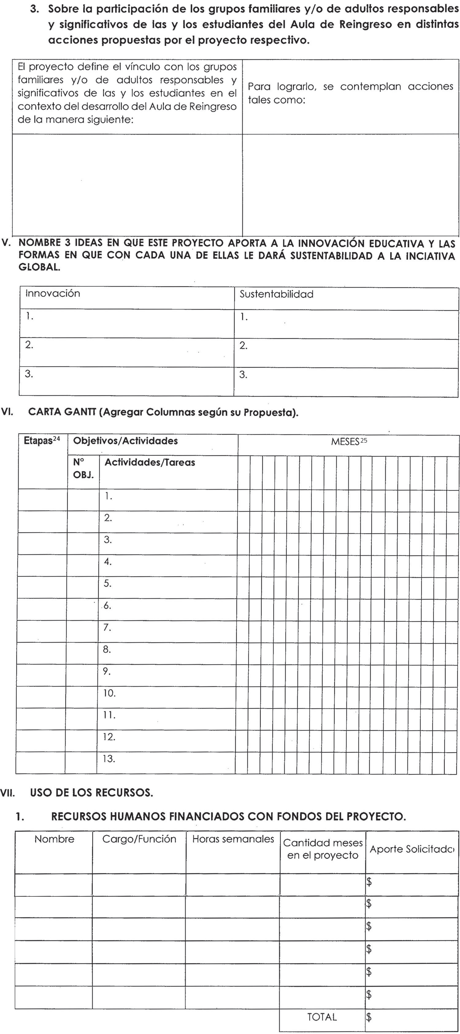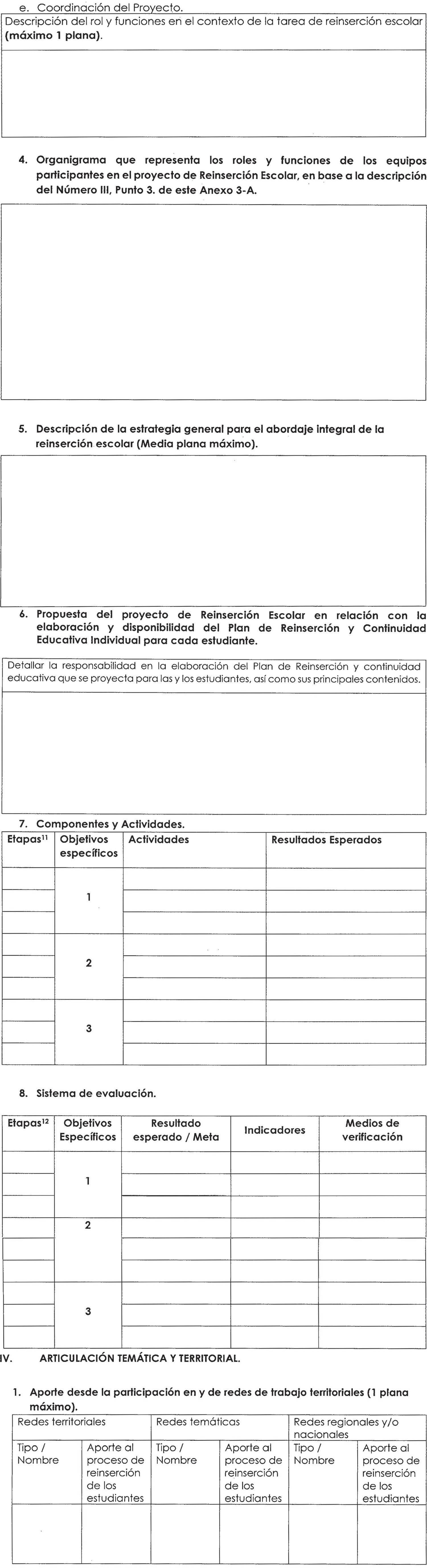 La propuesta de trabajo se elaborará de acuerdo a las presentes Bases Técnicas, que deberá ser entregada en el formulario que se adjunta en el Anexo 3, según el proyecto que corresponda a la propuesta, esto es, 3-A "Proyectos de Reinserción" y 3-B "Proyectos de Aulas de Reingreso".
