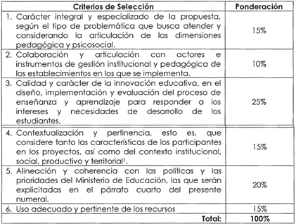 La Comisión Técnica de Preselección de las propuestas seleccionará los proyectos de las Instituciones proponentes, ya sean de Reinserción Educativa o de Aulas de Reingreso, de acuerdo con los criterios establecidos en el Artículo 8º del D.S. N° 32, de 2011, del Ministerio de Educación y sus modificaciones, según la ponderación que se indica en la presente tabla.