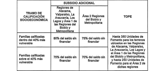 ii. Se aplicará un subsidio inicial destinado a la adquisición del terreno, de hasta 250 Unidades de Fomento, en los terrenos ubicados en las regiones de Atacama, Valparaíso, la Araucanía, Los Lagos y el Área 1 de las regiones del Biobío y Metropolitana, y de hasta 200 Unidades de Fomento en el Área 2 de las regiones del Biobío y Metropolitana.