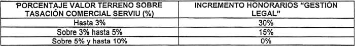 11.5. Los honorarios de Asistencia Técnica correspondientes al servicio "Gestión Legal", se incrementarán con un monto adicional, de acuerdo a la relación entre la tasación del terreno y el precio, según el cuadro siguiente: