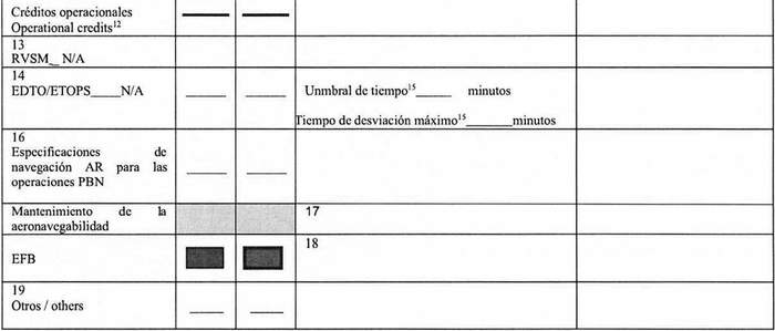 19. En este espacio pueden ingresarse otras autorizaciones o datos, utilizando una línea (o cuadro de varias líneas) por autorización (p.ej. autorización especial de aproximación, performance de navegación aprobada, etc.).