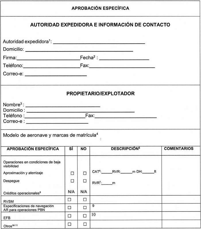 11. Aquí pueden anotarse otras aprobaciones específicas o datos utilizando una línea (o un bloque de varias líneas) por aprobación (p.ej., aprobación específica para operaciones de aproximación MNPS).