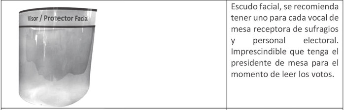 b) Escudos faciales para los vocales de mesa, siendo obligatorio el uso por parte del presidente/a de mesa al momento del escrutinio.
