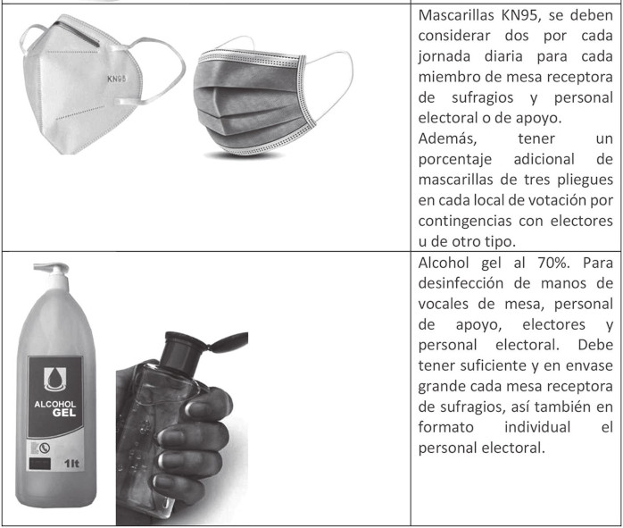 - El día de la constitución de mesas se dispondrá de kits sanitarios básicos para los vocales de mesas receptoras de sufragios y para personal con rol electoral (alcohol gel al 70% y mascarillas quirúrgicas desechables de tres pliegues).