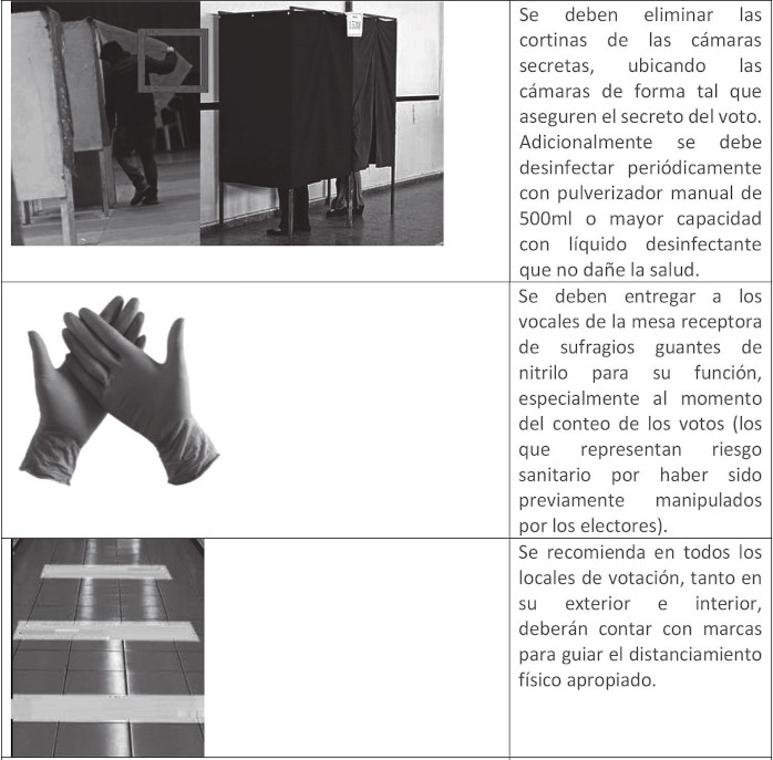 - Una vez emitido el voto, los electores tendrán que hacer abandono inmediato del local de votación por la salida dispuesta para ello. Es importante procurar impedir los contactos sociales, conversaciones y saludos en el interior del recinto de votación. Las declaraciones, entrevistas o conferencias de prensa de cualquier persona deberán ser realizadas afuera de los locales de votación.