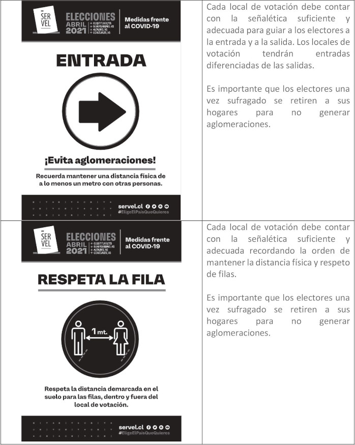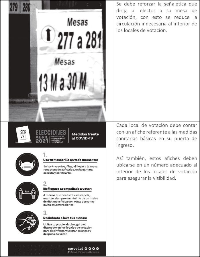 - Tanto en el exterior como en el interior de los locales de votación, se deben colocar afiches que orienten al elector sobre medidas sanitarias, entradas y salidas.