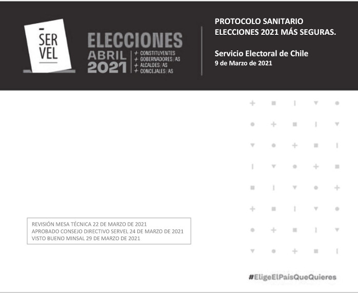 El Servicio Electoral de Chile hace un llamado al electorado para que los días 10 y 11 de abril de 2021, donde se celebrarán las Elecciones de Constituyentes, Gobernadores Regionales, Alcaldes y Concejales, acudan con sus propios implementos de protección sanitaria (alcohol gel al 70% y mascarilla, idealmente quirúrgicas desechables de tres pliegues). No obstante lo anterior, los días 9, 10 y 11 de abril se dispondrá de kits sanitarios para colaborar en un apropiado resguardo de las medidas recomendadas por el Ministerio de Salud.