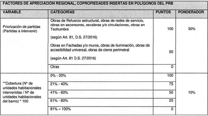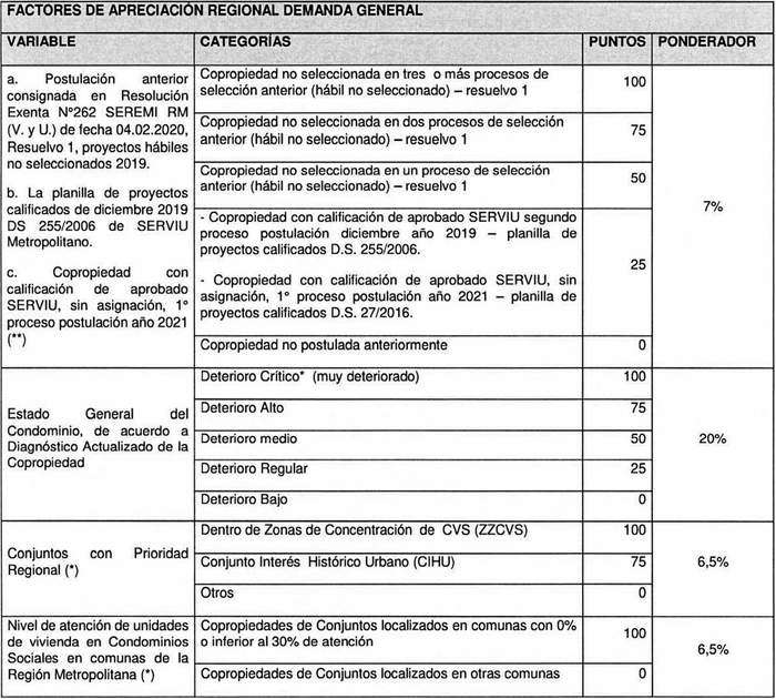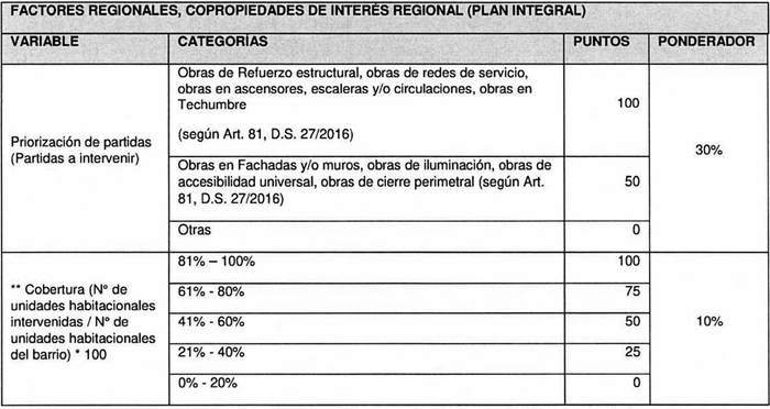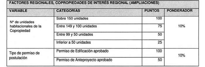 Nota 1: Aquellos proyectos que consideren obras de ampliación y mejoramiento de forma simultánea, serán ponderados según tabla denominada: Factores Regionales, Copropiedades de Interés Regional.