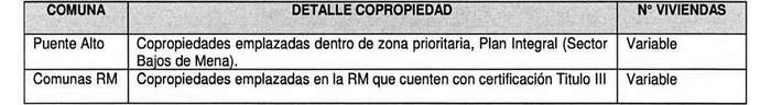 Establécese, además que la demanda habilitada en certificación del conjunto San Miguel 4 y Mamiña II, que han sido seleccionadas en intervención por el Programa de Recuperación de Barrios, pero que a su vez forma parte de Copropiedades emplazadas dentro de zona prioritaria, Plan Integral (Sector Bajos de Mena), sea abordada presupuestariamente por esta última.