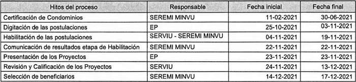 El Serviu Metropolitano comunicará a la Entidad Patrocinante las calificaciones y, en el caso de los rechazos, las inconformidades detectadas y deberá excluir dicho proyecto del proceso de selección. Los plazos correspondientes a esta fase serán los siguientesResolución 1307 EXENTA,