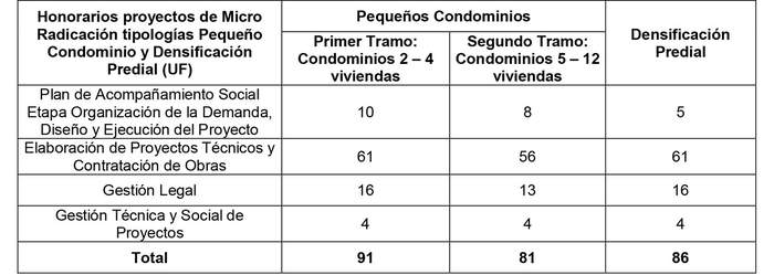 Los honorarios correspondientes al área de "Plan de Acompañamiento Social Etapa Organización de la Demanda, Diseño y Ejecución del Proyecto" a que se refiere el cuadro inserto en el inciso precedente, se incrementarán en 5 Unidades de Fomento cuando los proyectos de la tipología Pequeño Condominio y Densificación Predial consideren en su ejecución actividades relacionadas al desarme y demolición de elementos de la vivienda existente, lo cual deberá ser certificado por el Serviu.