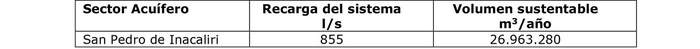 9.- Que, respecto a la recarga del sistema, el informe consigna que el Servicio cuenta con la información para estudiar el rendimiento del sistema de manera más precisa, pues por medio de la Minuta Técnica DARH N° 26, de 2020, se logró establecer la recarga del sistema en 885 litros por segundo, lo que se traduce en un volumen sustentable igual a 26.963.280 metros cúbicos anuales, expresada en la siguiente tabla: