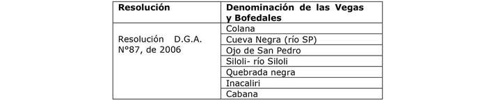 12.- Que, el Informe especifica cuáles son las vegas y bofedales que cuentan con protección oficial en el sector acuífero de aprovechamiento común San Pedro de Inacaliri, conforme la siguiente Tabla: