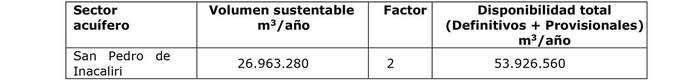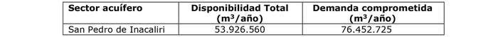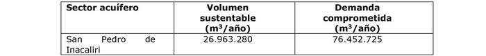 14.- Que, tras ello, efectúa un análisis del volumen sustentable del acuífero y su demanda comprometida, señalando que esta última supera significativamente la disponibilidad y oferta de recursos hídricos, lo que conlleva a que exista un riesgo de grave disminución de los niveles del sector hidrogeológico de aprovechamiento común San Pedro de Inacaliri, con el consiguiente perjuicio de derechos de terceros ya establecidos en él, no existiendo disponibilidad de recursos hídricos para la constitución de nuevos derechos de aprovechamientos subterráneos en calidad de definitivos, conforme la siguiente Tabla: