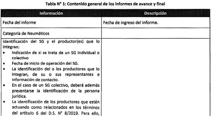 La siguiente Instrucción de Carácter General tiene por objeto precisar la información que los Sistemas de Gestión (SG) de neumáticos deberán entregar en el informe de avance y en el informe final que, anualmente, deben presentar ante el Ministerio del Medio Ambiente (MMA), de acuerdo con lo establecido en el artículo 17 del DS MMA N°8/2019.