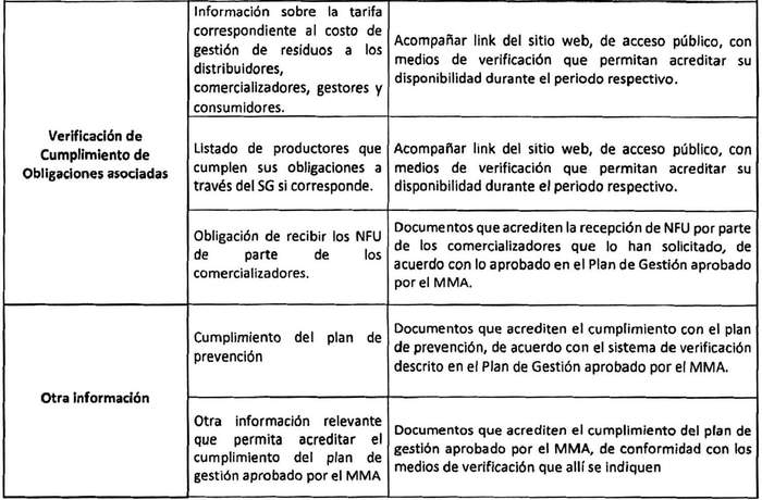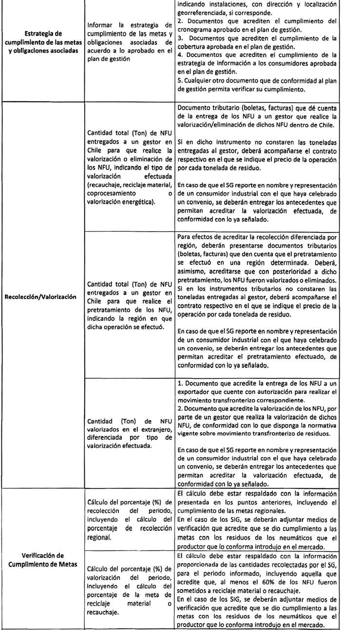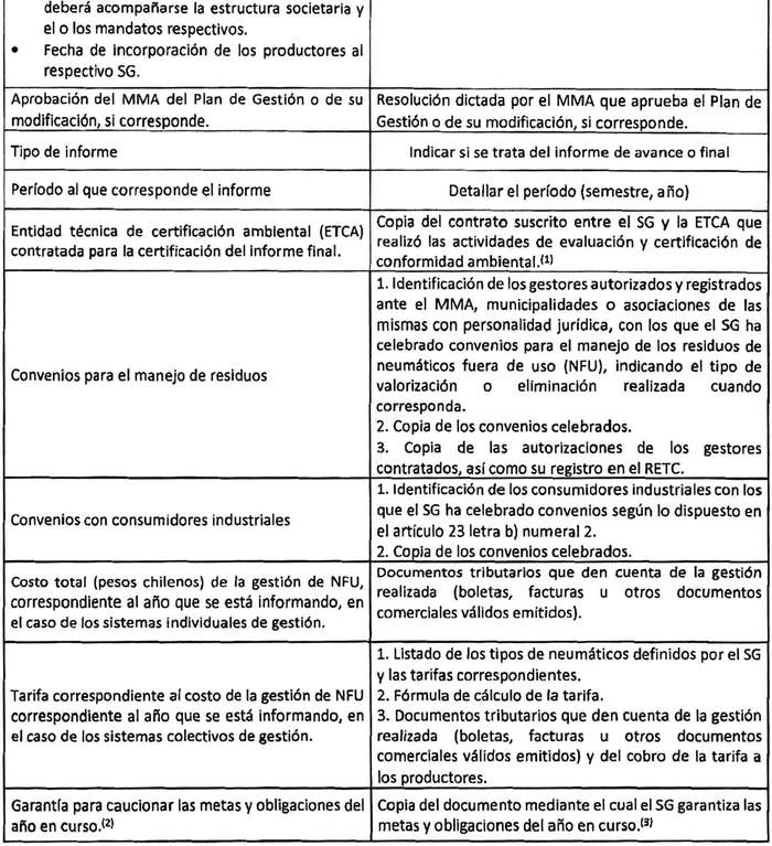 9. Que, asimismo, el artículo 17 del DS MMA N°8/2019 indica que el informe final deberá contener, al menos: la cantidad de productos prioritarios introducidos en el mercado, por los productores que integran el sistema de gestión, en el período inmediatamente anterior; una descripción de las actividades realizadas; el costo de la gestión de residuos del año que se está informando, en el caso de un sistema individual, y la tarifa correspondiente al costo de la gestión de residuos y su fórmula de cálculo, en el caso de un sistema colectivo; y, el cumplimiento de las metas de recolección y valorización, así como de las obligaciones asociadas, si correspondiere. Además, deberá acompañarse una nueva garantía para caucionar las metas y obligaciones del año en curso, según se establece en el inciso final del artículo 18 del DS MMA N°8/2019.