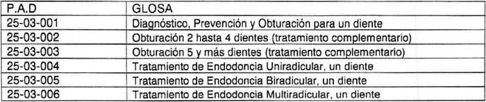 - Para los códigos 25-03-004, 25-03-005 y 25-03-006, endodoncias, para la indicación correcta de la obturación y rehabilitación con resina, deben cumplirse criterios clínicos y radiográficos.