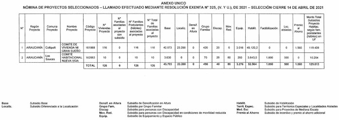 5. Los recursos comprometidos en el Resuelvo 2. y 4. de la presente resolución, para los proyectos seleccionados en el concurso a que se llamó por resolución exenta Nº 325 (V. y U.), de 2021, y sus modificaciones, en el cierre de postulación efectuado el día 14 de abril de 2021, se resumen en el siguiente cuadro, incluyendo la suma total de familias beneficiadas y Unidades de Fomento comprometidas, considerando los montos de subsidio de los proyectos, incluidos sus respectivos servicios de asistencia técnica y fiscalización técnica de obras: