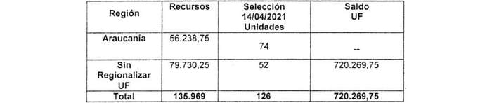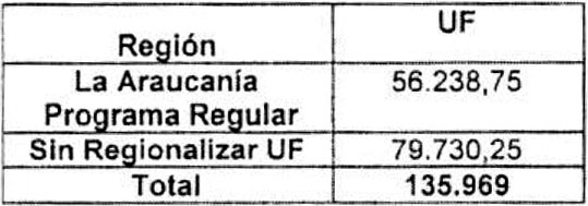 Para efectos de la imputación de los recursos comprometidos en el Resuelvo anterior, se descontarán del Programa Regular del Fondo Solidario de Elección de Vivienda de la Región de la Araucanía 56.238,75 Unidades de Fomento, y 79.730,25 Unidades de Fomento a los recursos Sin Regionalizar identificados en la circular Nº 1, de 25 de enero de 2021, del Subsecretario de Vivienda y Urbanismo.