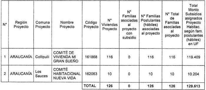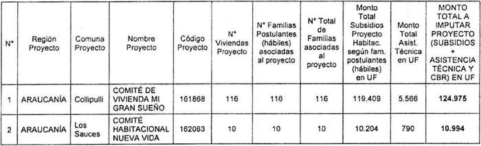2. Apruébase los proyectos seleccionados con su respectivo financiamiento total, el cual incluye los servicios de asistencia técnica y fiscalización técnica de obras identificados en el Resuelvo 6., para el otorgamiento de subsidios del Programa Habitacional Fondo Solidario de Elección de Vivienda en la alternativa de postulación colectiva, para proyectos de Construcción en Nuevos Terrenos, en la Región de la Araucanía, correspondiente al proceso de selección cuyo cierre de postulación se efectuó el día 14 de abril de 2021, del llamado efectuado por resolución exenta Nº 325 (V. y U.), de 2021, y sus modificaciones: