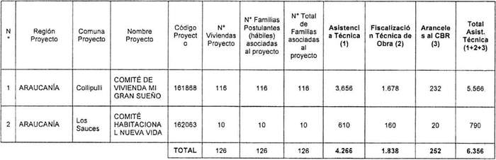 4. Asígnase a los proyectos seleccionados en el Resuelvo 2. de la presente resolución, por concepto de pago por los Servicios de Asistencia Técnica, por las Labores de Fiscalización Técnica de Obra y pago de Aranceles al Conservador de Bienes Raíces, los montos expresados en Unidades de Fomento que se detallan a continuación: